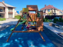 Большой уличный домик дает больше возможностей для увлекательной игры. Конструктивно он представляет собой коттедж с двускатной крышей, дверью, окнами,столиком, лавочкой и дополнительными игровыми возможностями.