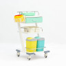 Манипуляционный стол с 2 полками и выдвижным ящиком, сделанный целиком из белого пластика*, с трёхсторонними боковыми ограждениями на полках.